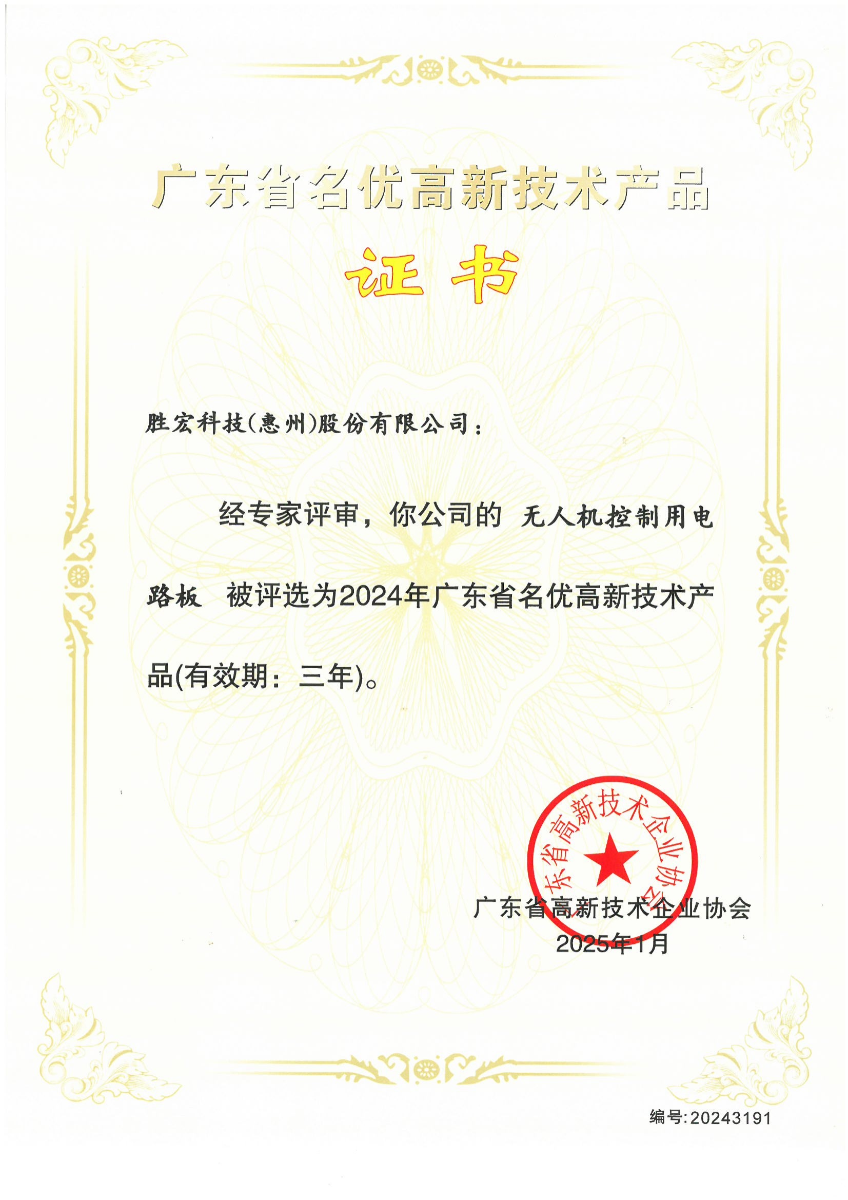 「ドローン制御用回路基板 」中國名優高新技術製品証明書